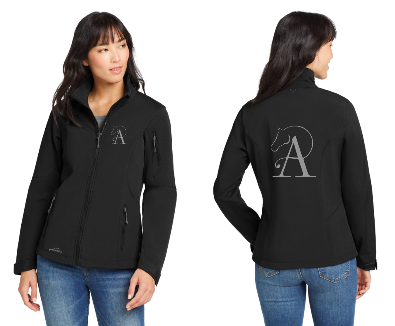 - Contrast heat transfer Eddie Bauer logo on right hem